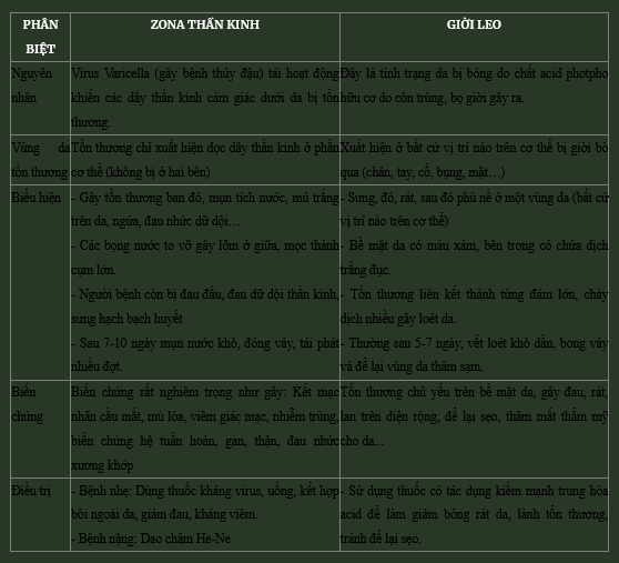 Zona thần kinh và giời leo là hai căn bệnh đều có đặc điểm chung là nổi các mụn nước trên da, tuy nhiên thực tế zona có mức độ nguy hiểm hơn rất nhiều, đe dọa nghiêm trọng đến sức khỏe người bệnh. Việc nhận biết và phân biệt hai căn bệnh này sẽ giúp việc chữa trị hiệu quả, đúng hướng, nhanh phục hồi hơn.